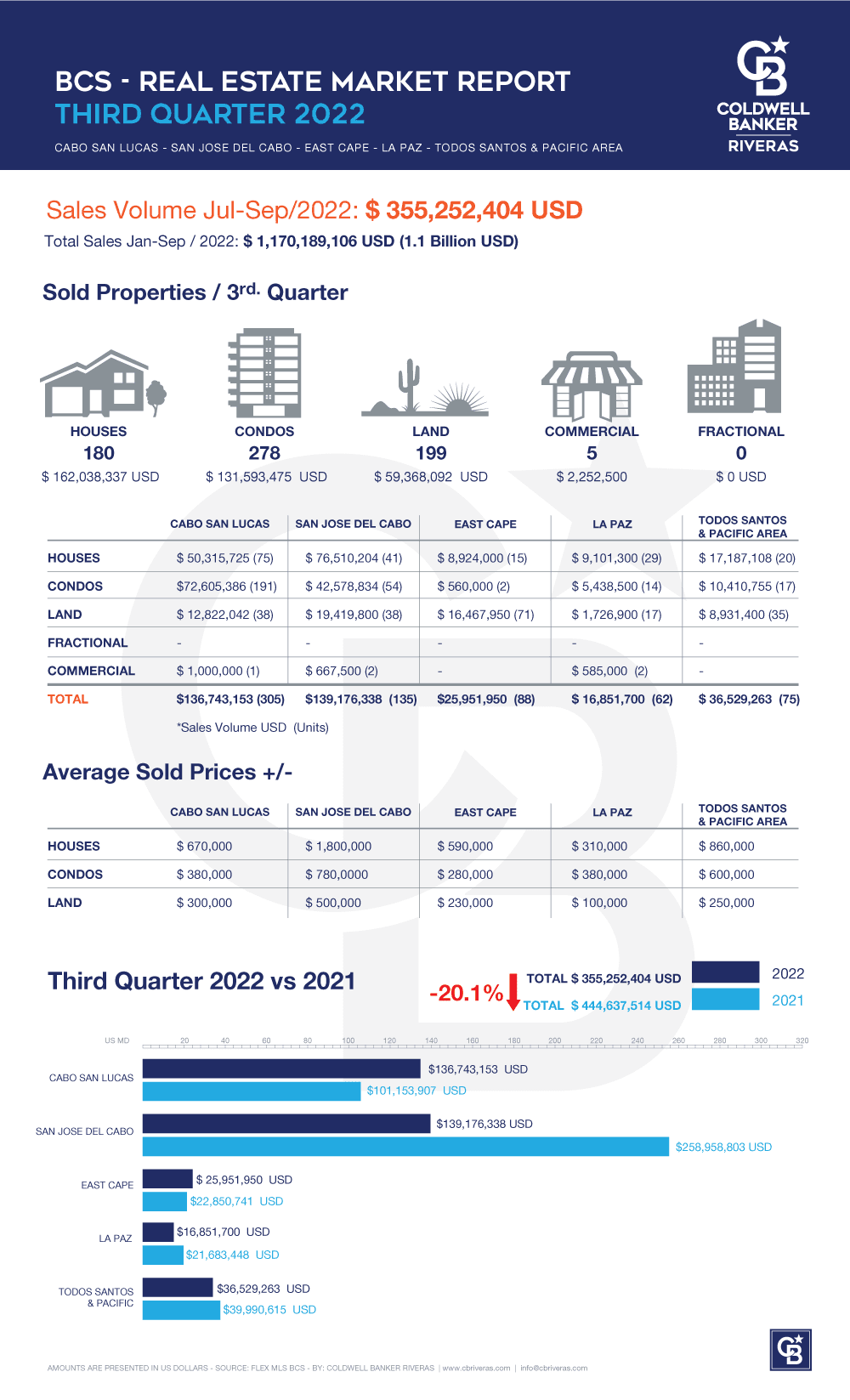Committed to provide relevant information about Real Estate in Baja California Sur, we present the market report for all agencies registered at MLS in the Third Quarter of 2022. Specifically for the areas of Cabo San Lucas, Corridor, San Jose del Cabo, East Cape, La Ribera, Los Barriles , La Paz, Todos Santos, Pescadero the Pacific area.