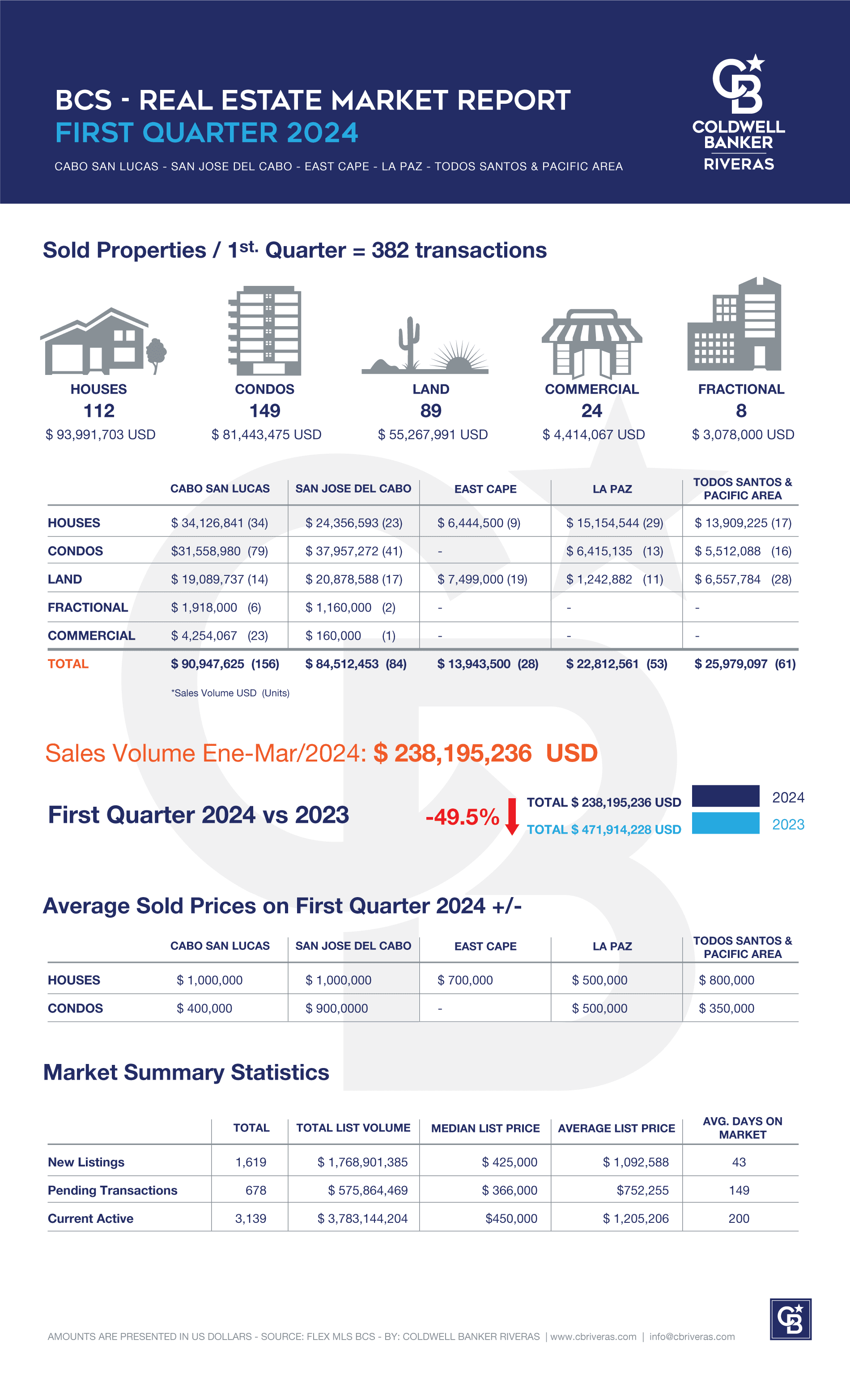 Welcome to the Baja California Sur Real Estate Market Report for the first quarter of 2024. In this quarter, the market has seen significant activity across various property types.