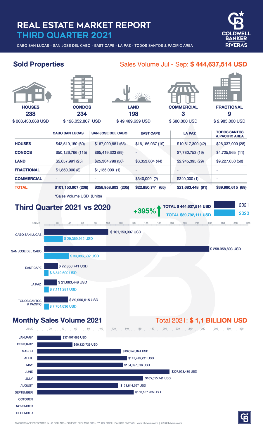 Committed to provide relevant information about Real Estate in Baja California Sur, we present the market report for the third quarter of 2021. Specifically for the areas of Cabo San Lucas, Corridor, San Jose del Cabo, East Cape, La Ribera, Los Barriles , La Paz, Todos Santos and Pescadero.